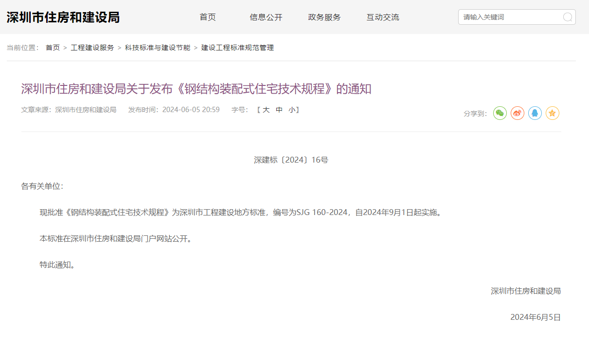 2024年6月5日,由中國(guó)建研院深圳分公司參與主編的深圳市工程建設(shè)地方標(biāo)準(zhǔn)《鋼結(jié)構(gòu)裝配式住宅技術(shù)規(guī)程》SJG160-2024正式發(fā)布,并將于2024年9月1日起正式實(shí)施。