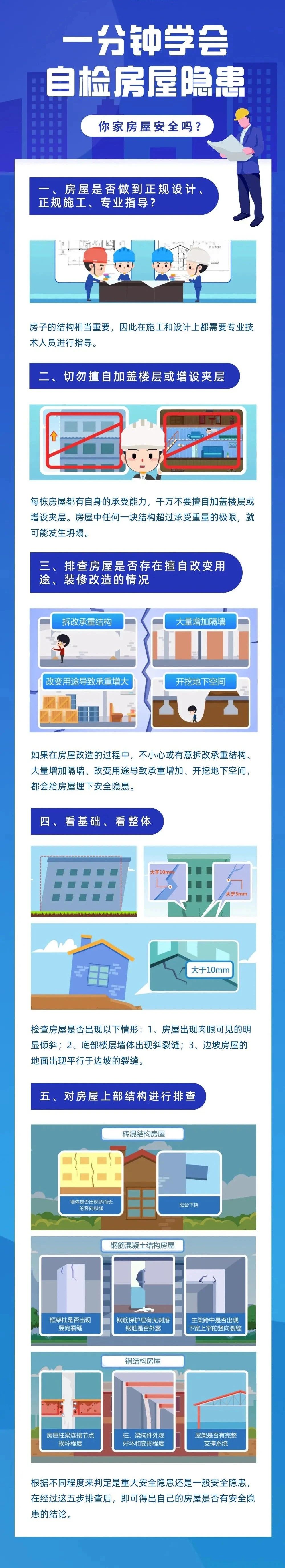房屋是日常生產(chǎn)生活的重要場所,房屋安全與大家生活品質(zhì)息息相關(guān)。房屋像人一樣,會(huì)經(jīng)歷“生、老、病、死”,從出生到死亡,有病要治病,沒病要體檢。平時(shí)會(huì)出現(xiàn)一些“病害”,如果沒有及時(shí)發(fā)現(xiàn)、早日醫(yī)治,慢慢會(huì)演變成傾斜、折斷、坍塌等“重癥”乃至“死亡”。關(guān)于房屋安全,這些知識(shí)您要及早了解。