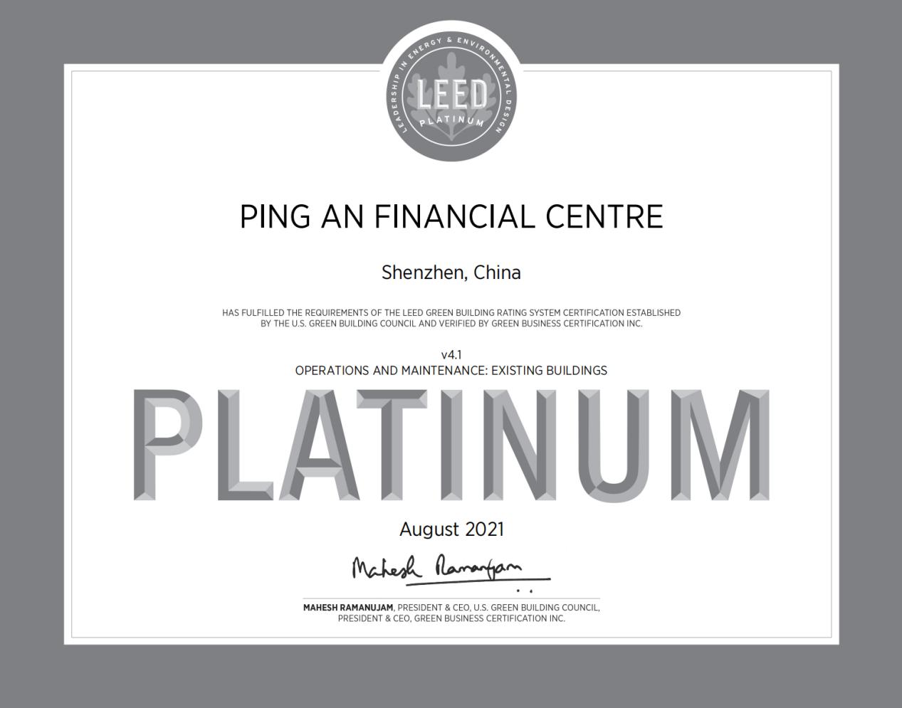 近日,中國建研院深圳分公司成功取得深圳平安金融中心國家三星級綠色建筑運行標(biāo)識和美國LEED O+M:EB(運營與維護(hù):既有建筑)鉑金級認(rèn)證。