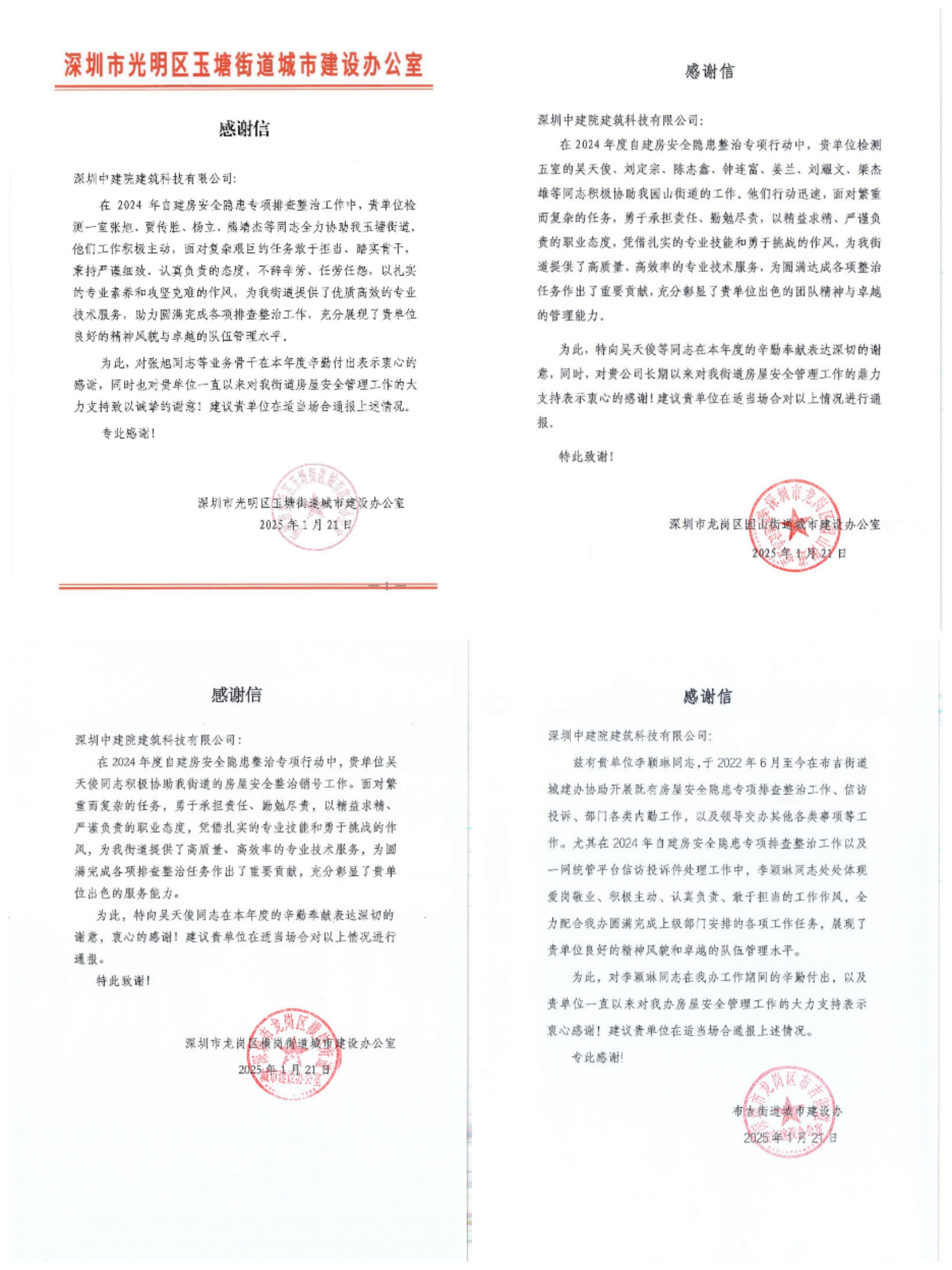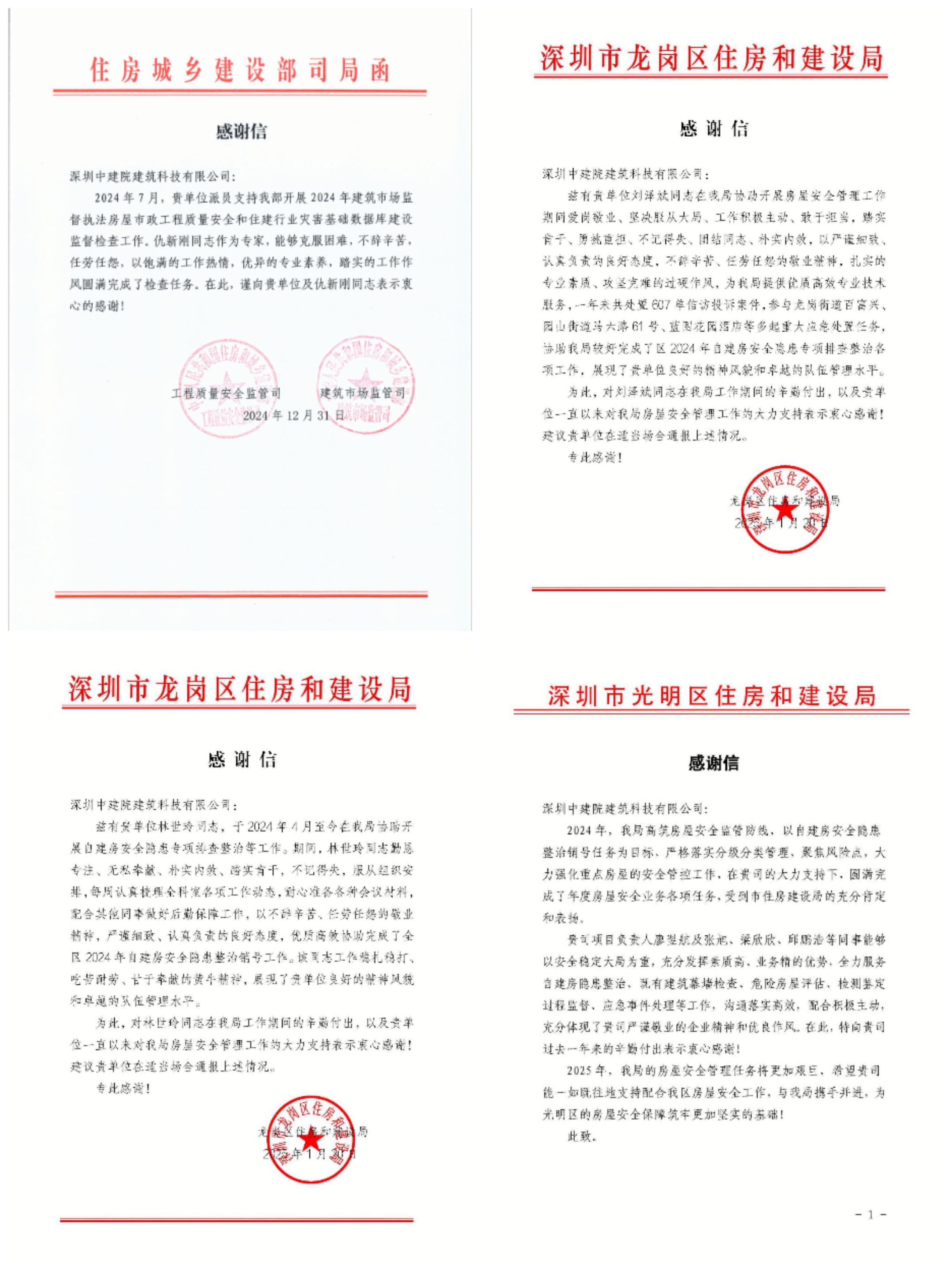 ?近日,中國(guó)建研院深圳分公司所屬深圳中建院陸續(xù)收到多封沉甸甸的感謝信——來自住房城鄉(xiāng)建設(shè)部工程質(zhì)量安全監(jiān)管司、建筑市場(chǎng)監(jiān)督司,深圳市光明區(qū)住房和建設(shè)局、龍崗區(qū)住房和建設(shè)局,及玉塘街道、園山街道、橫崗街道、布吉街道、平湖街道、新橋街道等政府部門。信中向深圳中建院在2024年建筑市場(chǎng)監(jiān)督執(zhí)法房屋市政工程質(zhì)量安全、住建行業(yè)災(zāi)害基礎(chǔ)數(shù)據(jù)庫(kù)建設(shè)監(jiān)督檢查工作中所作出的貢獻(xiàn),以及多年來對(duì)深圳市區(qū)住建部門、街道等轄區(qū)主管部門在房屋安全管理工作的默默付出表示感謝。